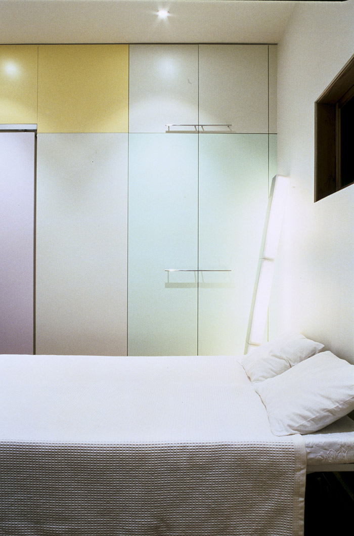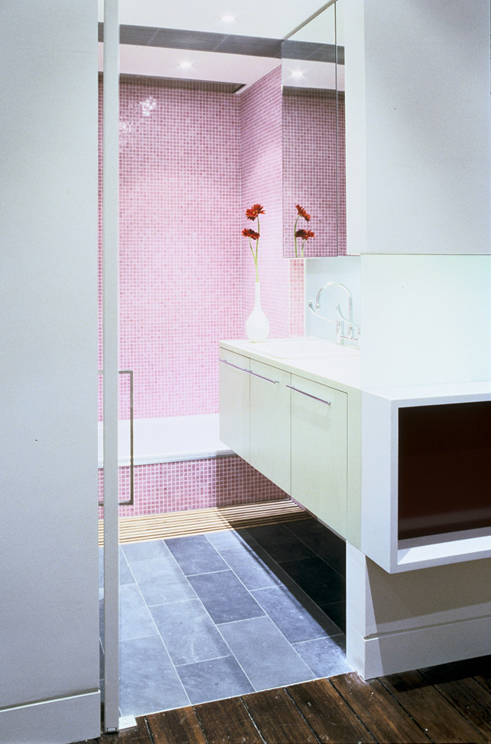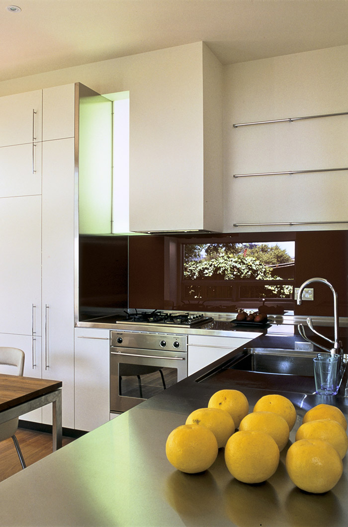 Full height sliders give an indoor/outdoor feel to the kitchen, bedrooms and study, which is reached by a raised “bridge” from a small landing to give a sense of separation between workspace and home. Windows have been relocated to capture especially precious mini-views; the parabolas of the Anzac Bridge, the twist of a gum tree bough. Small areas of intense color – a Pilbarra-red glass splashback, an aubergine window seat, fuscia bathroom tiles -draw the eye through what is now a bright jewel-box of a home, in which every centimeter is maximised for use and pleasure.