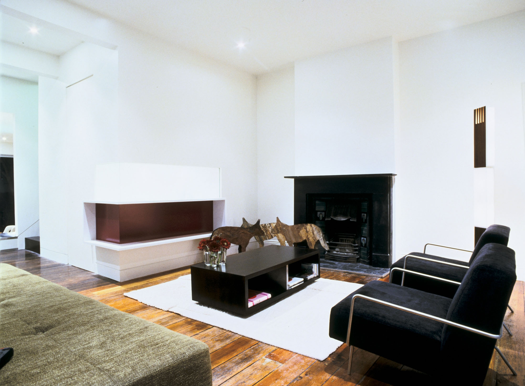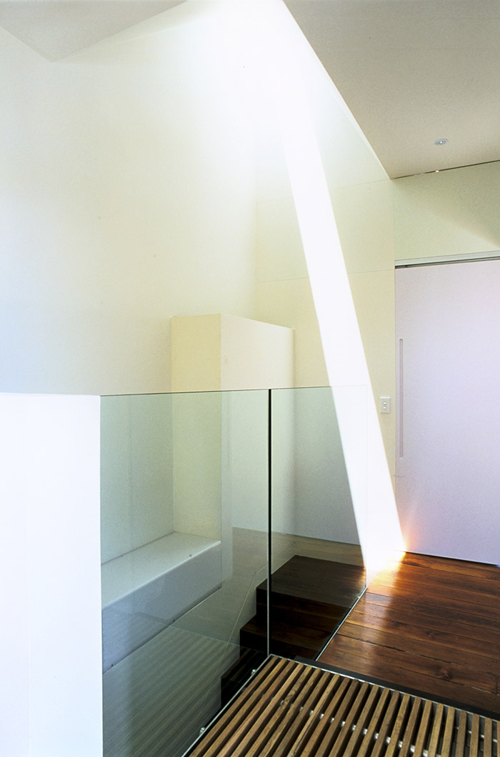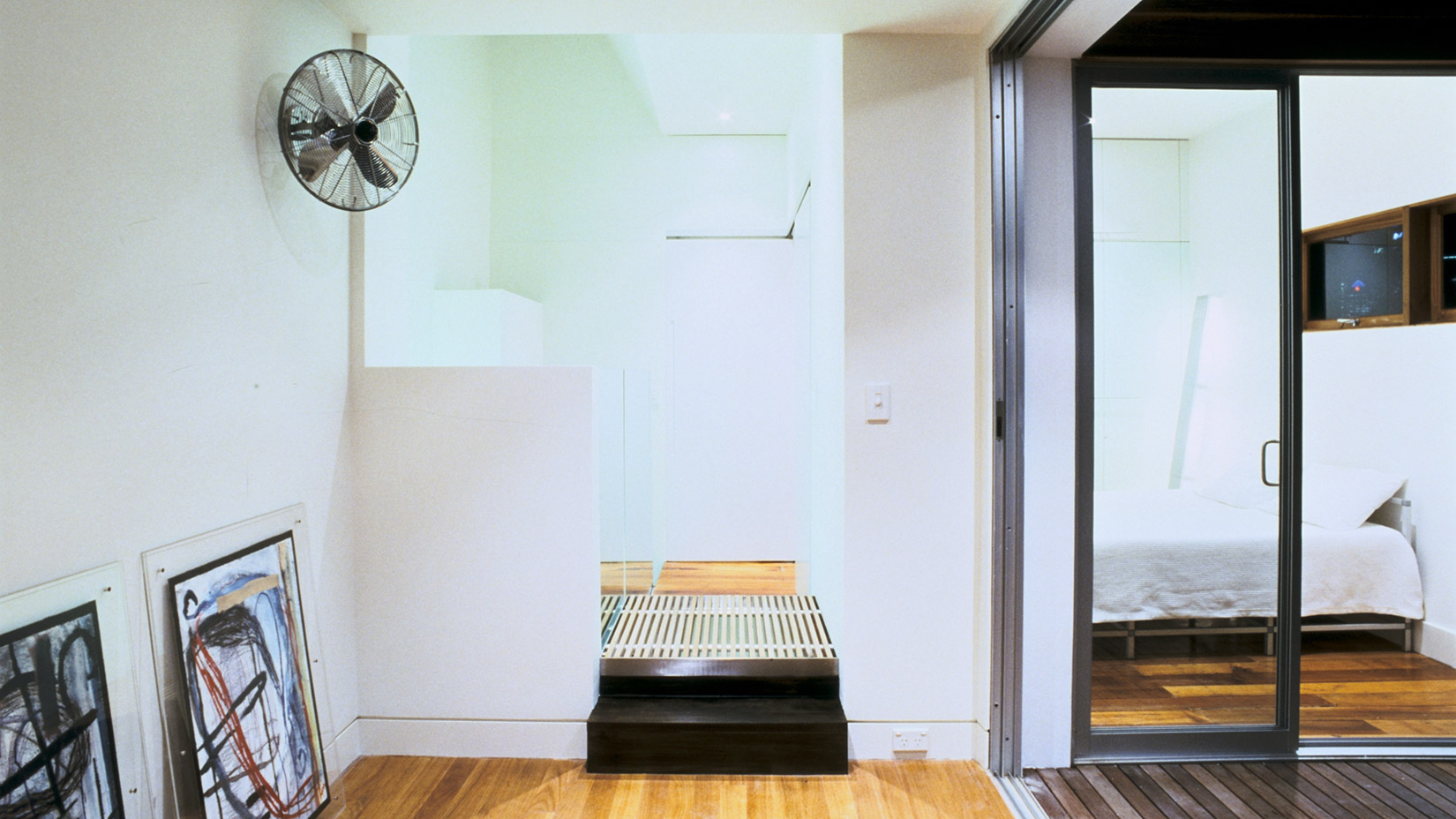 Before renovation, the residence was a cramped, 2-bedroom timber terrace sited on an escarpment overlooking Cameron’s Cove, Balmain. The location of stairs and bathroom effectively cut the living spaces off from the potential views and gave the interior a claustrophobic feel. The brief – to create an open-plan living area relating to the outdoors, to add an office/study and a contemporary bathroom and kitchen – required a virtual rebuilding of the home, retaining only three external walls of the original. Now, from a modest and traditional terrace facade, the interior opens both horizontally and vertically to vistas of water, trees and sky. A through-the-house lightwell brings brightness to the bathroom, relocated in the center of the building.