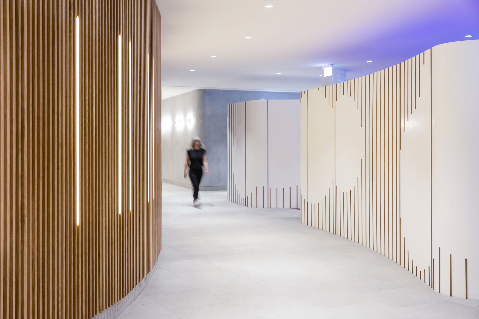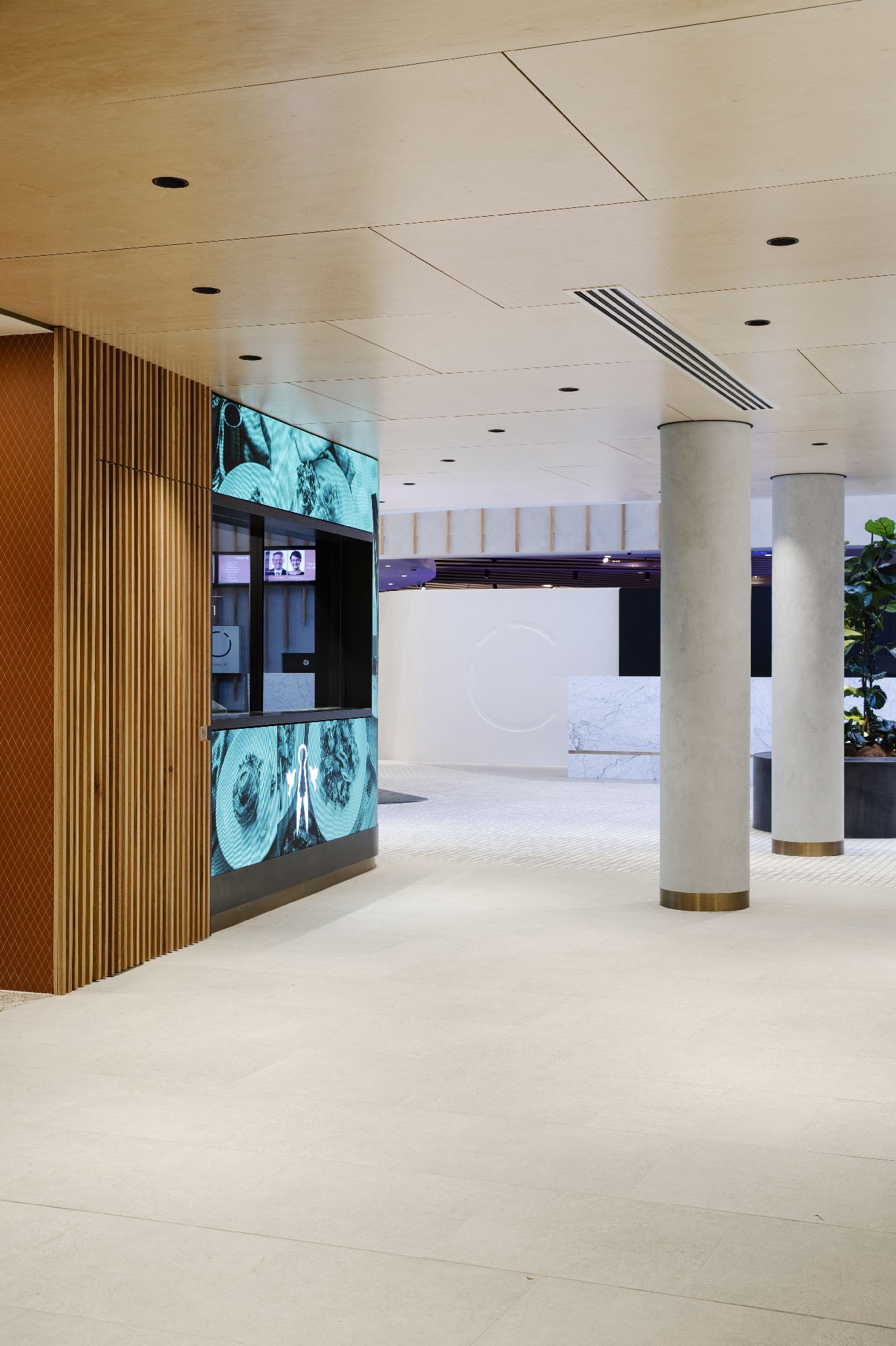 The existing foyer was dated and functionally problematic: a centrally placed staircase blocked lines of sight and hindered access to the club beyond; a wide concierge desk created the impression of a checkpoint. In contrast, the new foyer is envisaged as an indoor street with a contemporary colour palette to evoke a serene but sophisticated atmosphere: the stair has been shifted to the edge to free up the central space; the large concierge desk has been replaced by two, smaller sign-in ‘pods’ in white Corian; new skylights introduce natural light; a row of trees enhances the outdoor feel; a new reception desk and lounge/waiting area complete the space. Brass accents add an air of sophistication to a rich material palette of marble, natural timbers and artisan plasterwork. Side walls feature a cloud motif in mosaic tiles and timber battens – the names of the first 100 foundation members are engraved on the battens, honouring the club’s proud heritage.