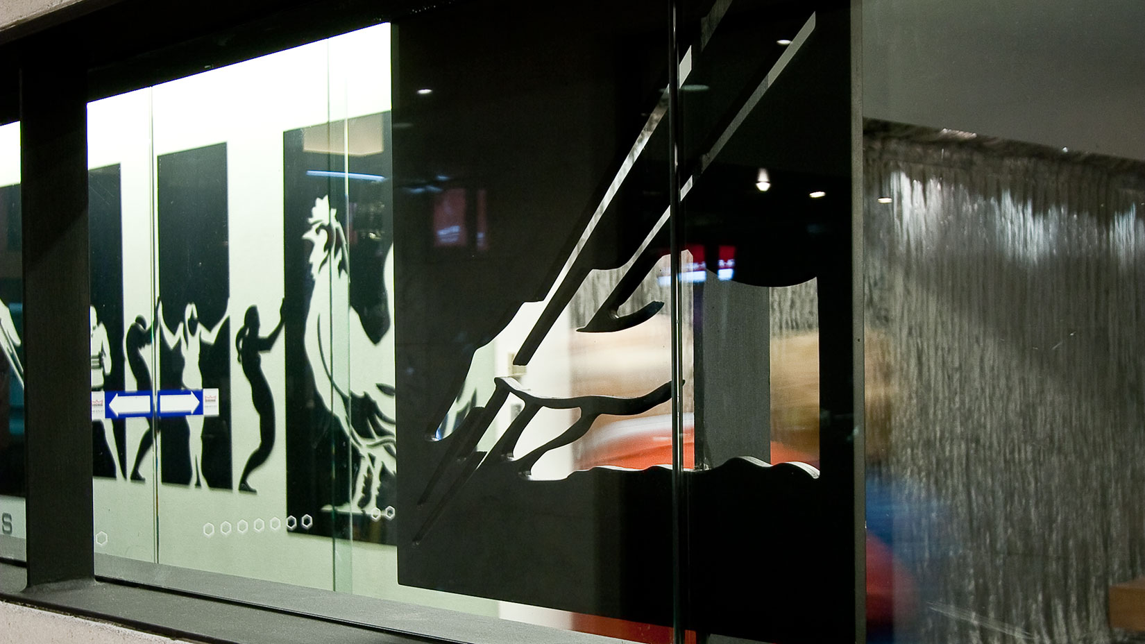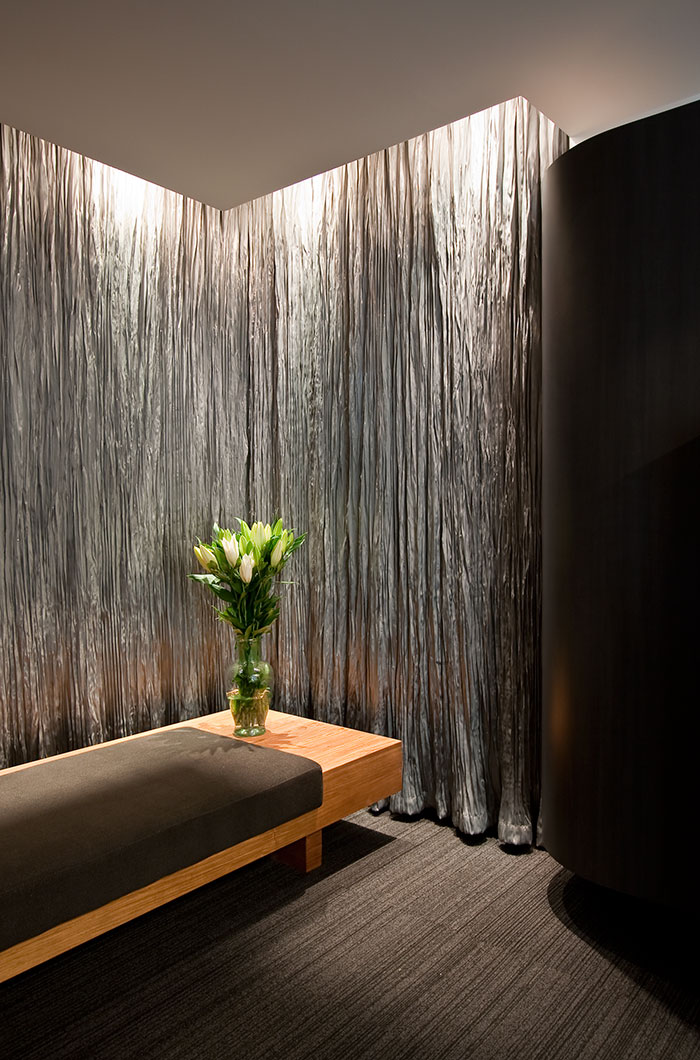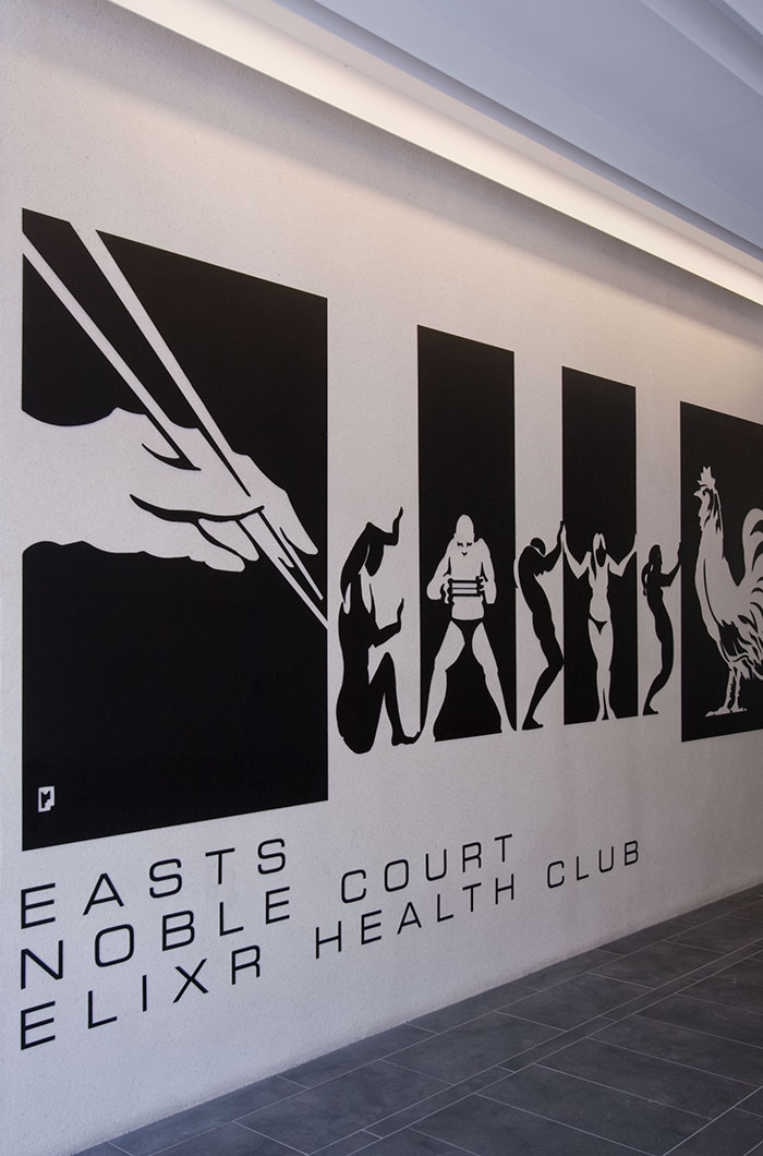 The central idea for the new foyer was to create a street presence with an elegant entry not only serving the Club, but also the independently operated restaurant and fitness centre – Elixr Bondi. Departing from the traditional club approach of neon-lit and brightly coloured signage, C I Partnership commissioned the artist Michael Fitzjames to produce a mural for the entry wall. Michael and our team worked together to come up with the ideas for the mural. The resulting artwork was digitised and CNC routed from sheets of 6mm aluminium, which were then anodised in satin black.