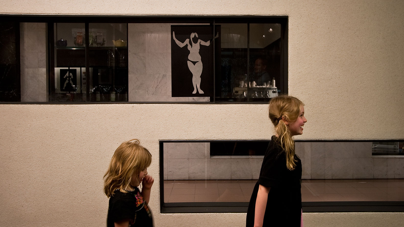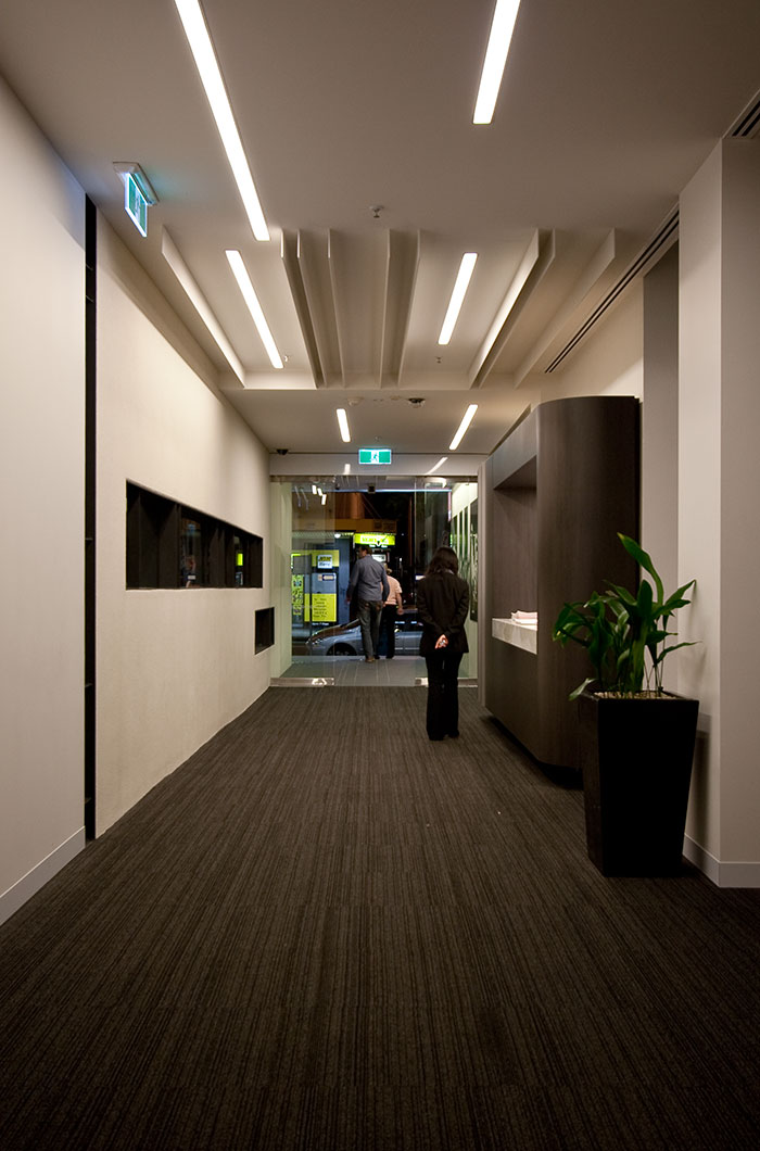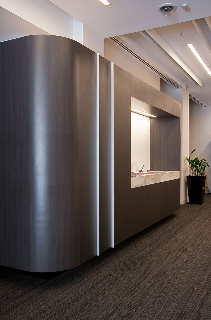 The monochromatic nature of the artwork was carried throughout palette of materials for the foyer, with shades of white for ceiling and walls and dark brown/black/metal gray for the joinery and floor finishes.
