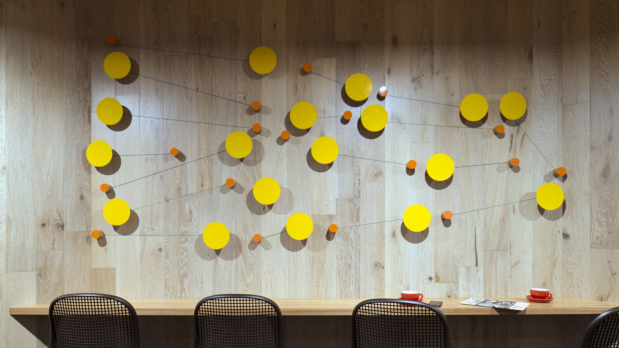 Spaces are punctuated with bright colours including; a green tiled wall creating a striking backdrop behind the bar, bright yellow feature wallpapers and a hexagonal yellow ceramic tiled wall to the sports lounge and through to the Sports Terrace beyond. The carpet is a custom design created by Korda Bros working with the C I Partnership interiors team and has subtle references to golf balls and the contours of putting greens. The wall to the dining area has a feature artwork panel based on an abstract of the course layout.