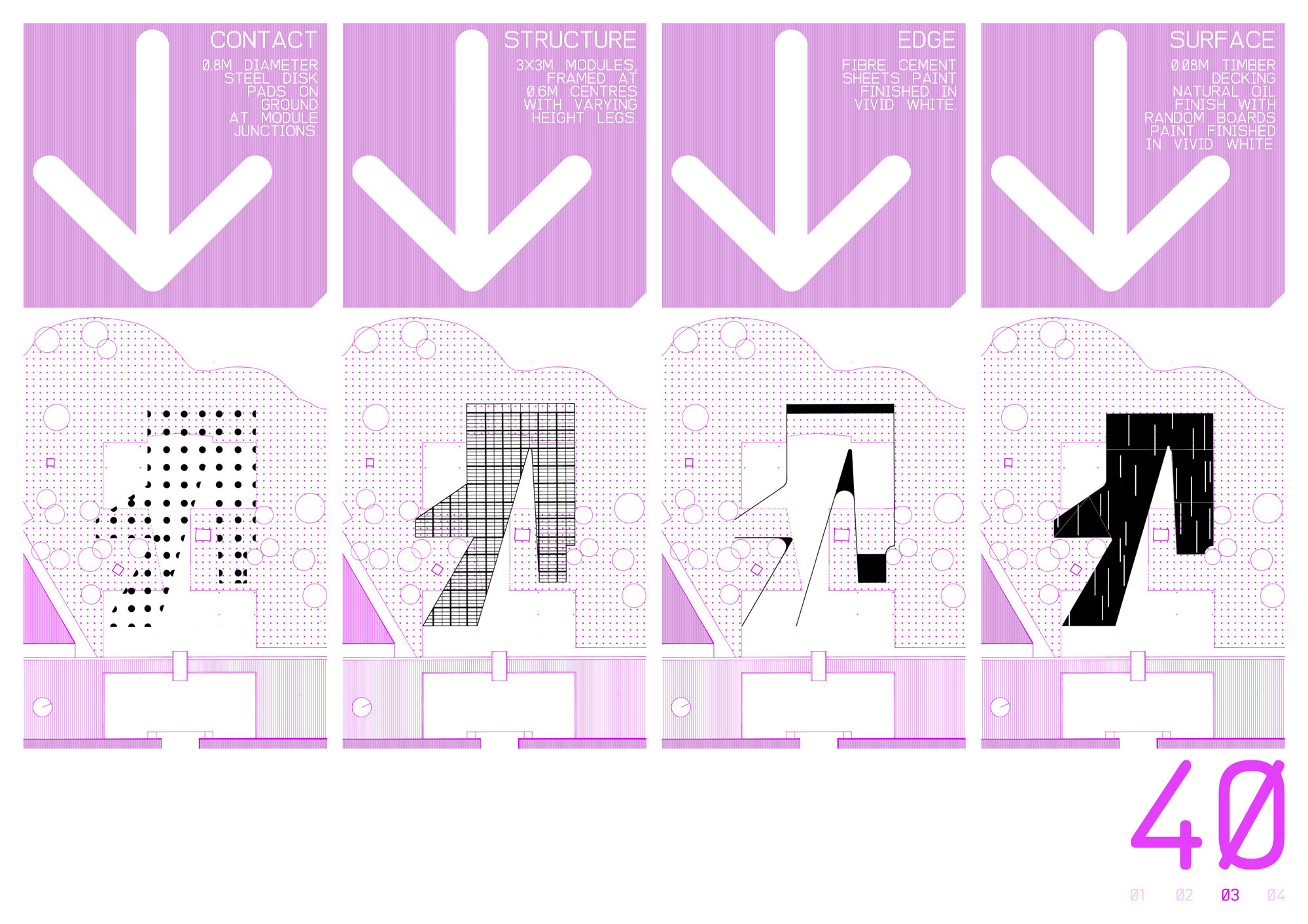 3000 x 3000mm modules, framing at 600mm centers with varying height legs.