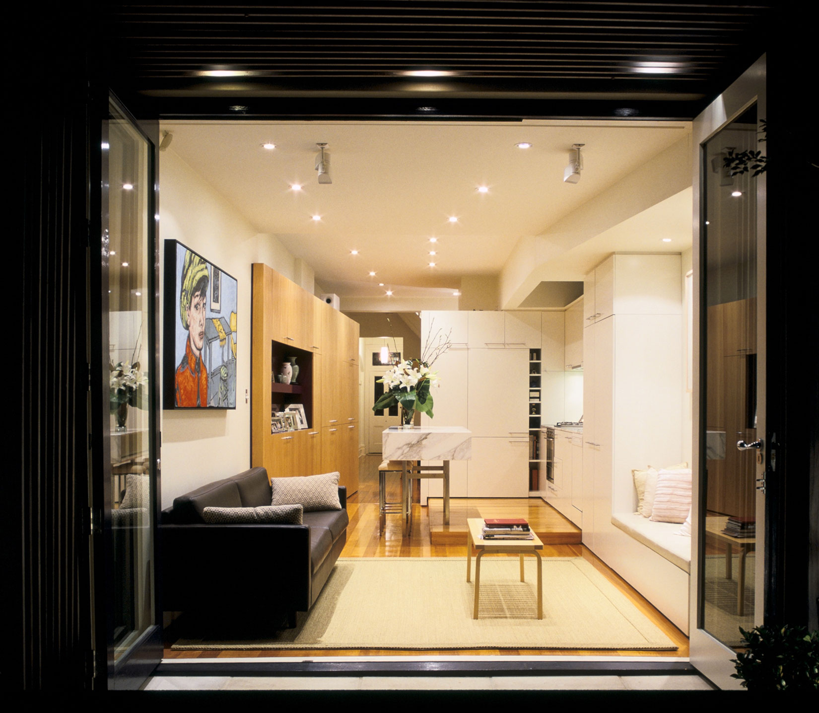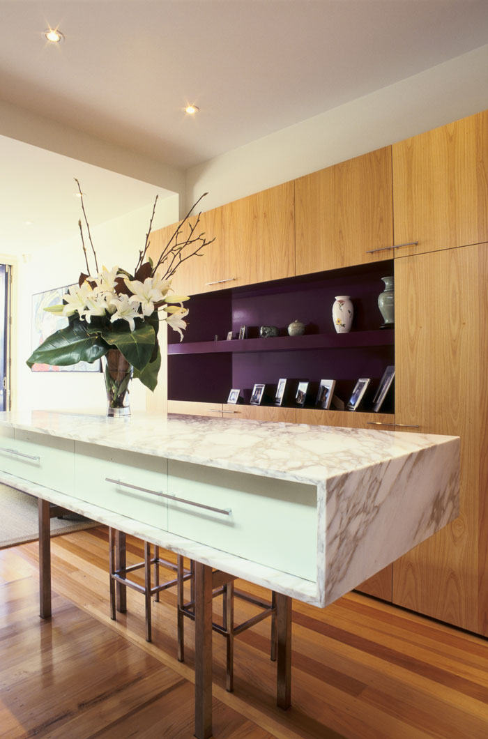 A guest W.C. is concealed behind a large sliding joinery cabinet, the only give-away sign being a long handle. The island bench is used as preparation bench on the kitchen side and as a breakfast bar on the passage side. The whole back area opens up to the rear courtyard with bi-fold doors under a timber slatted shading portal.