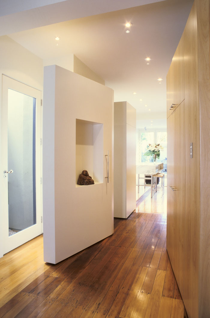 A typical two storey terrace house, with dark interiors. We remodeled it by extending into the breezeway and leaving a light-well into the middle of the footprint. The front room was kept untouched and all remaining internal walls were removed. A new galley kitchen is situated along the reclaimed breezeway with a long run of skylights above, which bring in much needed natural light into the space. The space is articulated by the joinery units which taper in and out to create the different spaces on the ground floor.