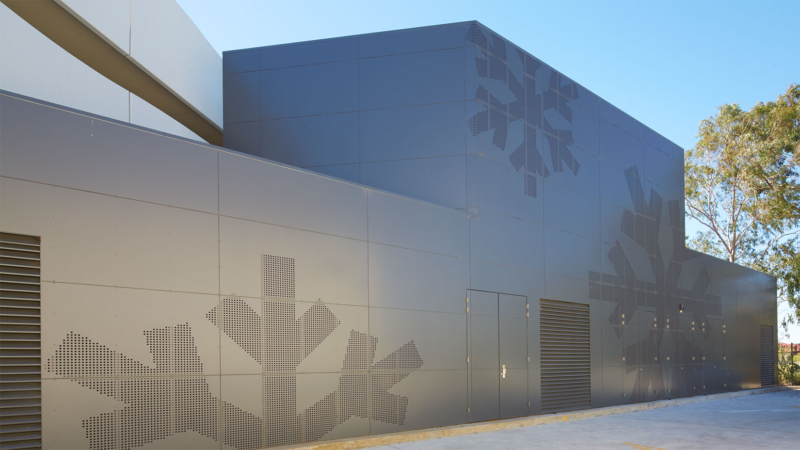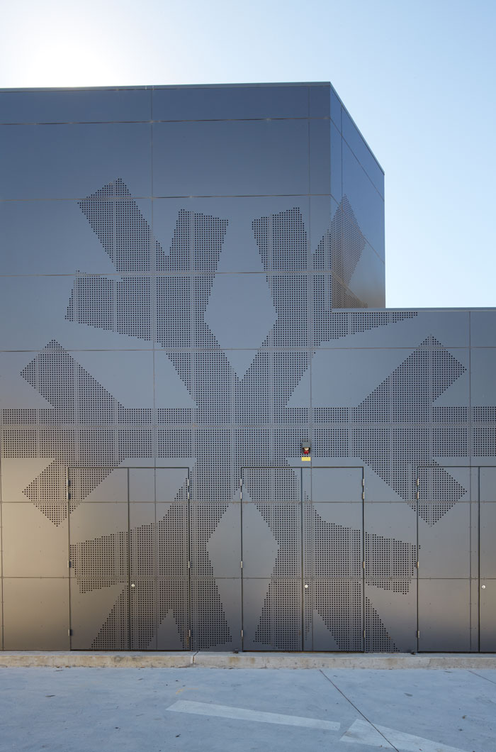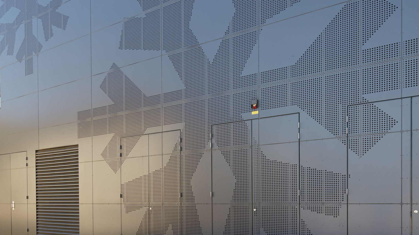 As the plant enclosure was highly visible C I Partnership designed the building enclosure to stand out rather than trying to conceal it. The building’s exterior is clad in Symonite panels with a metallic finish. To add interest we designed a pattern in the form of an abstract snowflake created using perforations in the Symonite sheets.