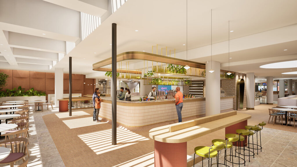 The building will be provided with an entirely new façade and entry sequence. The façade echoes the original mid-century modern architectural style. A new verandah-like alfresco food and beverage area will create a vibrant frontage visible from the Princes Highway and featuring a striking circular, faceted rotunda dining space.